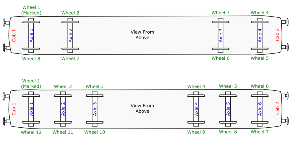 Number 1 wheel is usually marked by an arrow above it on the vehicle body. It can be difficult to spot if you’re not certain. If the vehicle is a driving vehicle in a Multiple Unit or other vehicle with only one cab, No. 1 end is going to be the cab end.