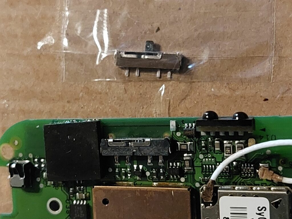 Removing the existing part is tricky – I removed the foam pad next to the switch and then used 300°C hot air to desolder the existing part. Low temperature desoldering solder would be risky because of the proximity of other SMD parts, snipping off the pins would be tricky because they seem to go under the switch, and the 4 pins mean it isn’t easy to get heat to all of them at the same time with a normal iron. I thankfully didn’t have any issues taking care with hot air.